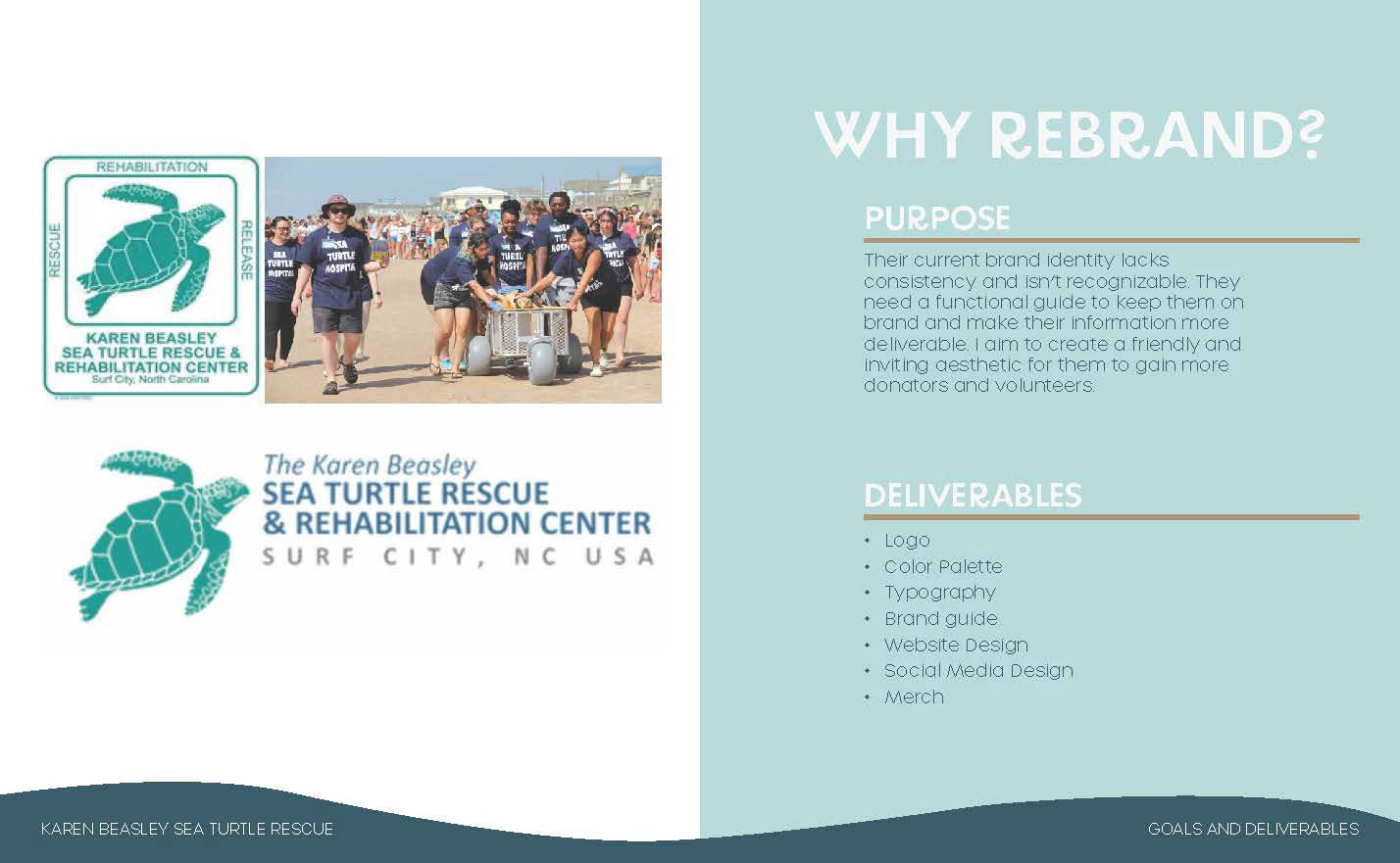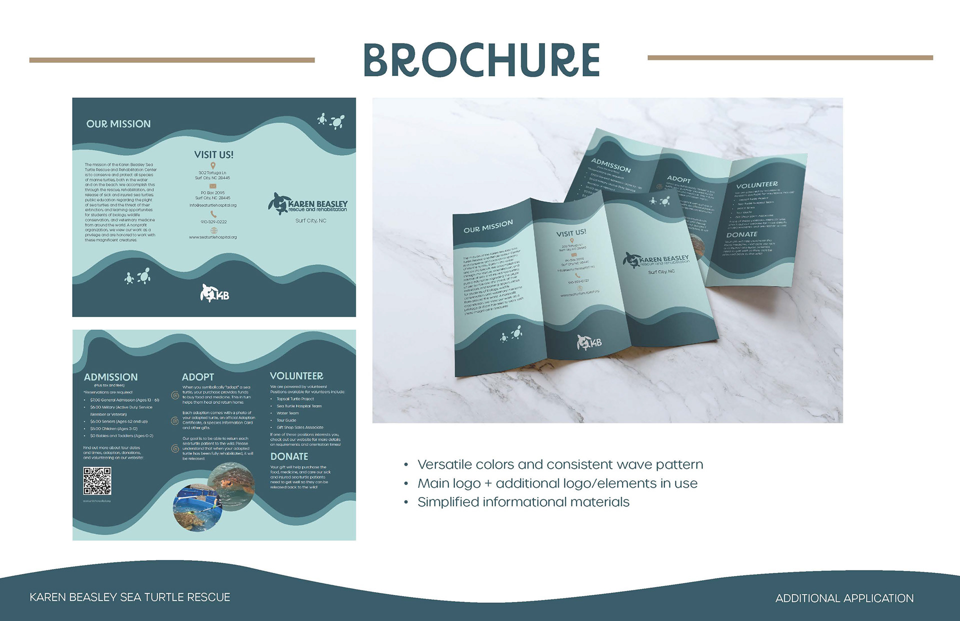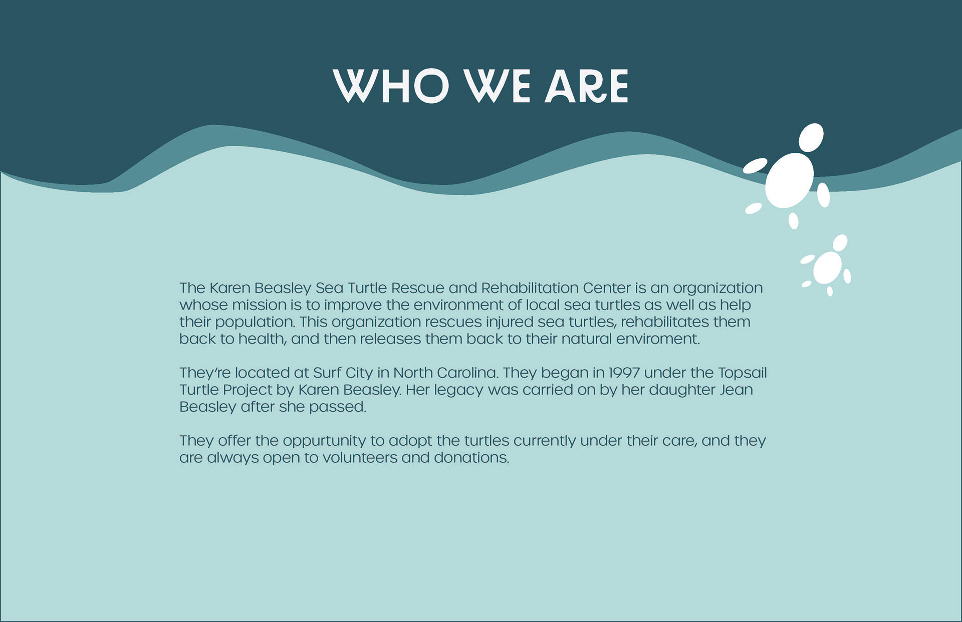 This project was focused around doing a re-branding for the non-profit organization Karen Beasley Sea Turtle Rescue and Rehabilitation Center. The goal was to create a cohesive, modern, and noticeable design that would help capture the voice of the organization. Brand guidelines and a mix of promotional material were created to showcase this redesign. A junior designer helped create other additional material based on the brand guidelines given.